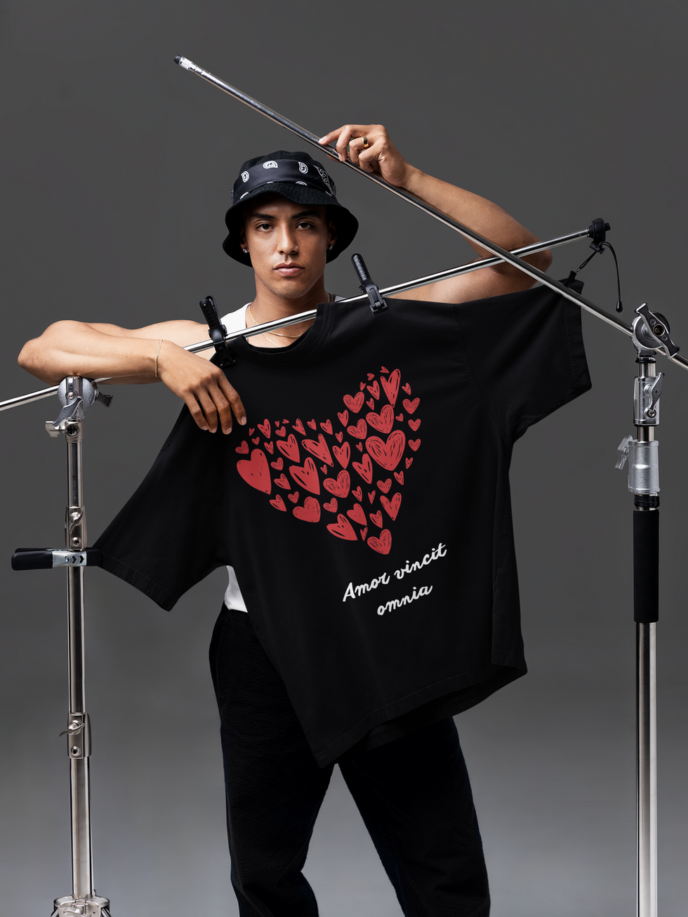 The Amor Vincit Omnia Oversized T-Shirt combines a soft visual message with an easy oversized silhouette. The front design features a heart shape built from hand-drawn red hearts, paired with the classic Latin phrase Amor Vincit Omnia, creating a look that feels personal, light, and quietly expressive.