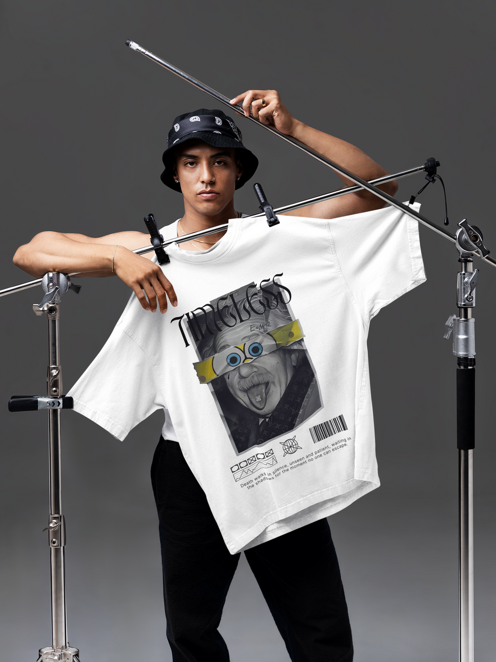 The Timeless Chaos Oversized T-Shirt is designed for people who prefer graphics with tension, contrast, and attitude. Built around a surreal collage composition, this piece mixes dark monochrome tones with unexpected visual interruptions to create a design that feels raw, offbeat, and intentionally chaotic.